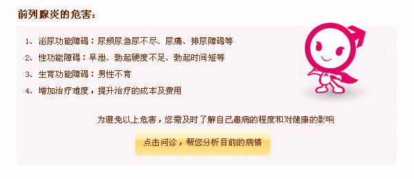 田医生强调:治疗前列腺炎,应用单纯的某一种或几种中药或者西药,效果都是不理想的,因为这是一个综合性,泌尿系统多部位的病变,必须采取综合药物治疗,中西医结合治疗方案,否则治疗往往会失败。因此,前列腺炎药物的副作用是不应该被患者忽视的,前列腺炎药物使用过多,反而会引起更加严重的情况。自行服药会出现哪些更严重的危害,点击了解详情